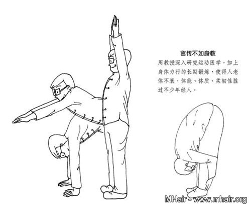 周教授邊講解邊示範,善聽立在教授身旁也同步練習了兩三回。與身手矯捷的周教授相比,善聽顯得笨拙僵硬,動作生澀遲緩,頗有力不從心的感覺。師徒兩人的年齡雖相差一倍之多,但身手實力落差之大卻成了反比。