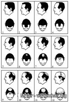 男性掉发可分为7个分期 (参考下图),改善掉发需要把握黄金时间,通常在第一、二期只要注意生活习惯和毛发保养就会有改善,当属于第三、四期者则应立即找专业的医师诊断并治疗, 基本上愈早治疗则改善掉发的情况就愈明显。 男性掉发者就医诊治或使用改善掉发的药物后,有一定比例可以达到抑制继续落发的现象,使用几个月后掉发区有时会出现细毛(villus hair),但是不论再使用多久的后续疗程,有些人的幼毛也不会变成永久毛,主要的原因和没有把握黄金时间有关。