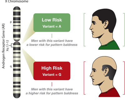 的人带有高风险的基因标志。HairDx的原理,基本上是找出X染色体上的基因标记,如果一个男士的X染色体中,测得一种特殊变异型(图中G变异型)的雄