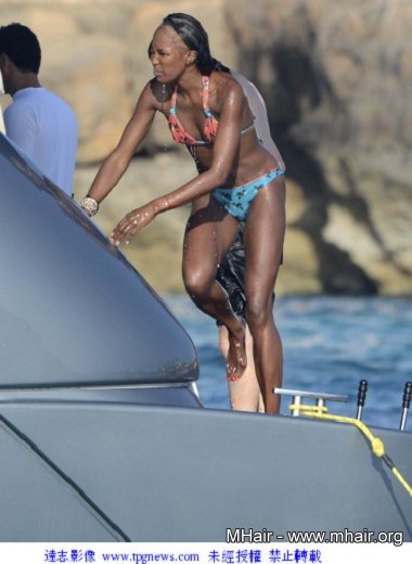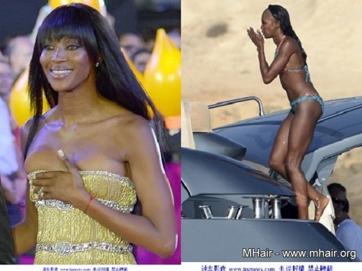 据美国网站报导,超级名模黑珍珠娜欧蜜坎贝尔日前现身西班牙海滩,与男友一同享受假期。身穿蓝橘相间艳丽颜色比基尼亮相的她,展现火辣身材。不过,眼尖的狗仔马上发现她的发线怪怪的。