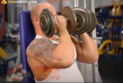 哑铃肩上推举(又叫坐姿推举哑铃),宽阔圆浑的肩膀是一个漂亮男子健美体型必不可少的部分。从解剖学来说,我们指定的就是肩膀下面的三角肌,由三束构成前束、中束和后束。