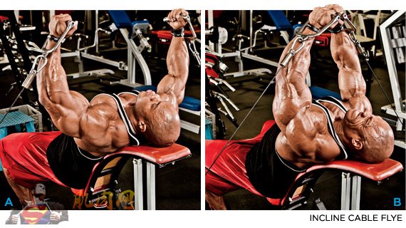 最后一个动作是上斜飞鸟,你使用的是绳索拉力器版本。而在健身房内,很少会看到有人使用这一训练动作。