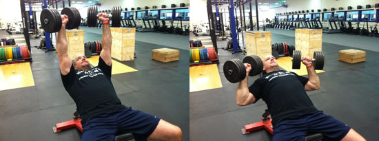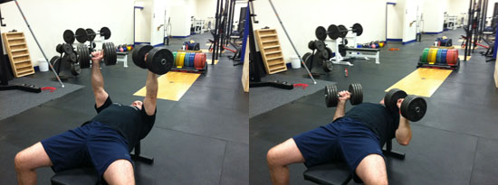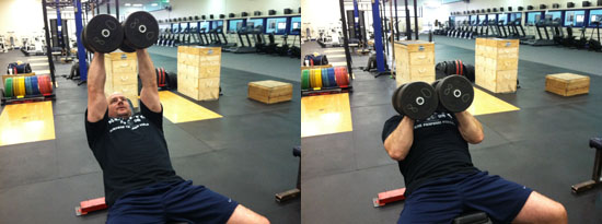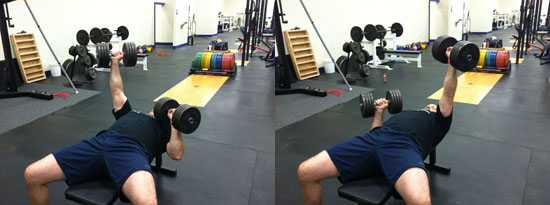平躺在训练凳上,双手各持哑铃。伸直双臂,将哑铃举起,手心相对。慢速下放哑铃直到上臂与地面平行为止。然后推起哑铃回到起始姿势,如此重复。注意在上推的过程中,确保竖直地推起哑铃,不要偏斜。