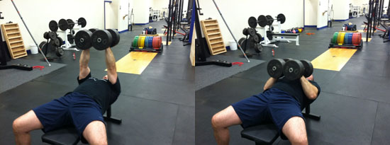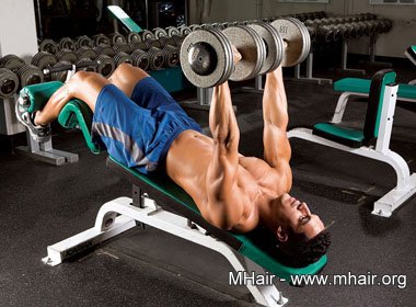 3、平板哑铃卧推(锻炼整个胸部、前三角肌、肱三头肌)