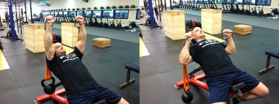 注意事项:推起重量时不要锁定肘关节。这样能使肌肉保持紧张状态,提高训练效果。
