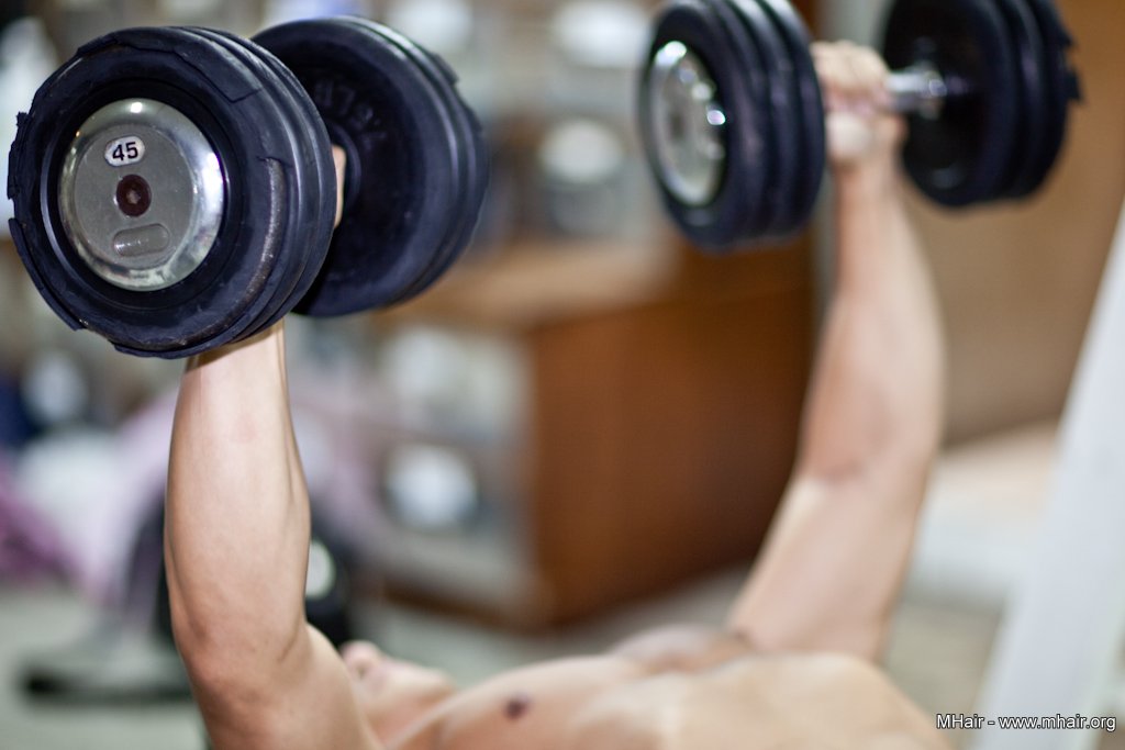 1.保持雙肘微彎的固定角度,下放到背平面即可,上舉時像抱一棵大樹一樣,不是直上直下,沿一定弧度推舉,感受胸肌的拉伸和收縮。